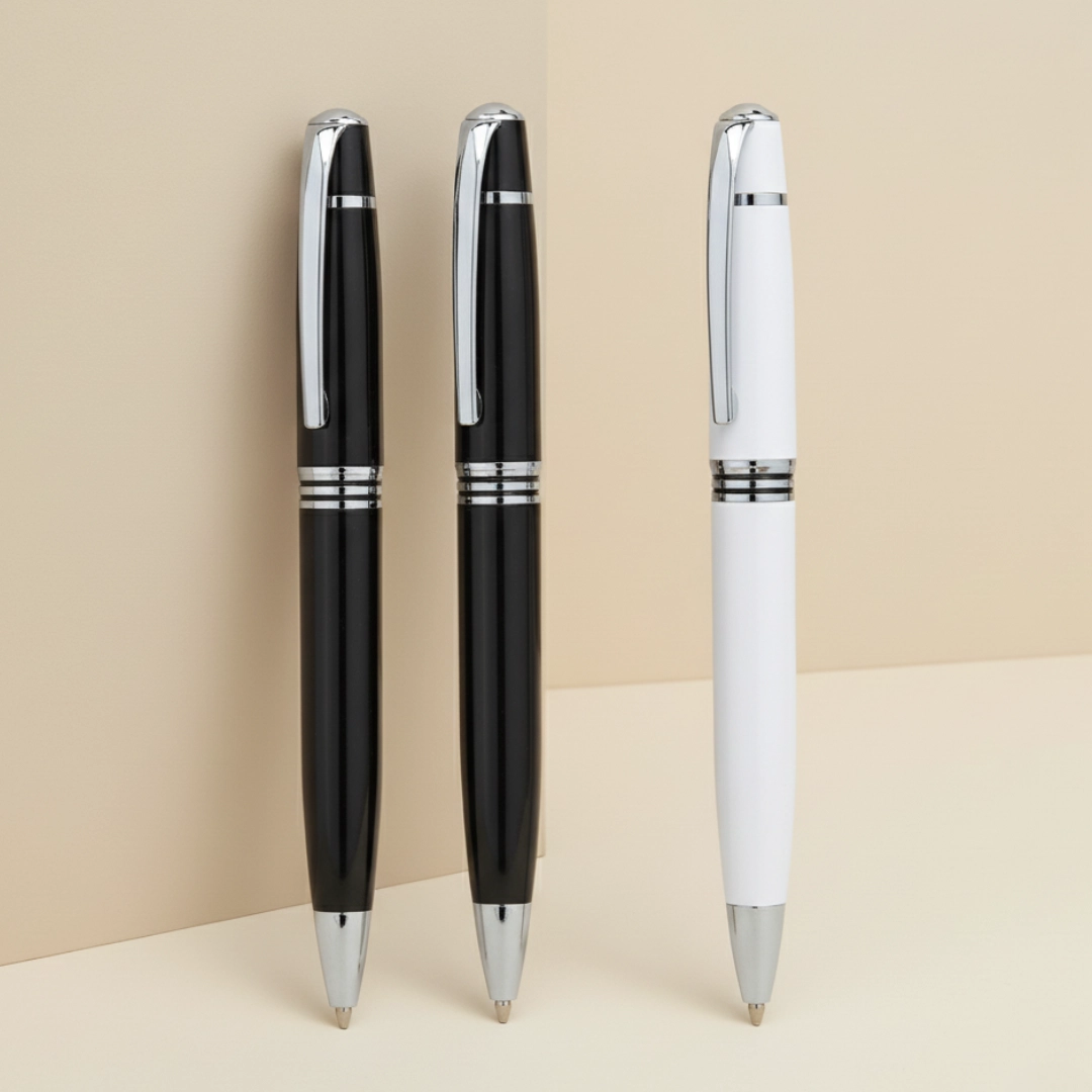 Bolígrafo metálico de acción giratoria + caja de papel duro