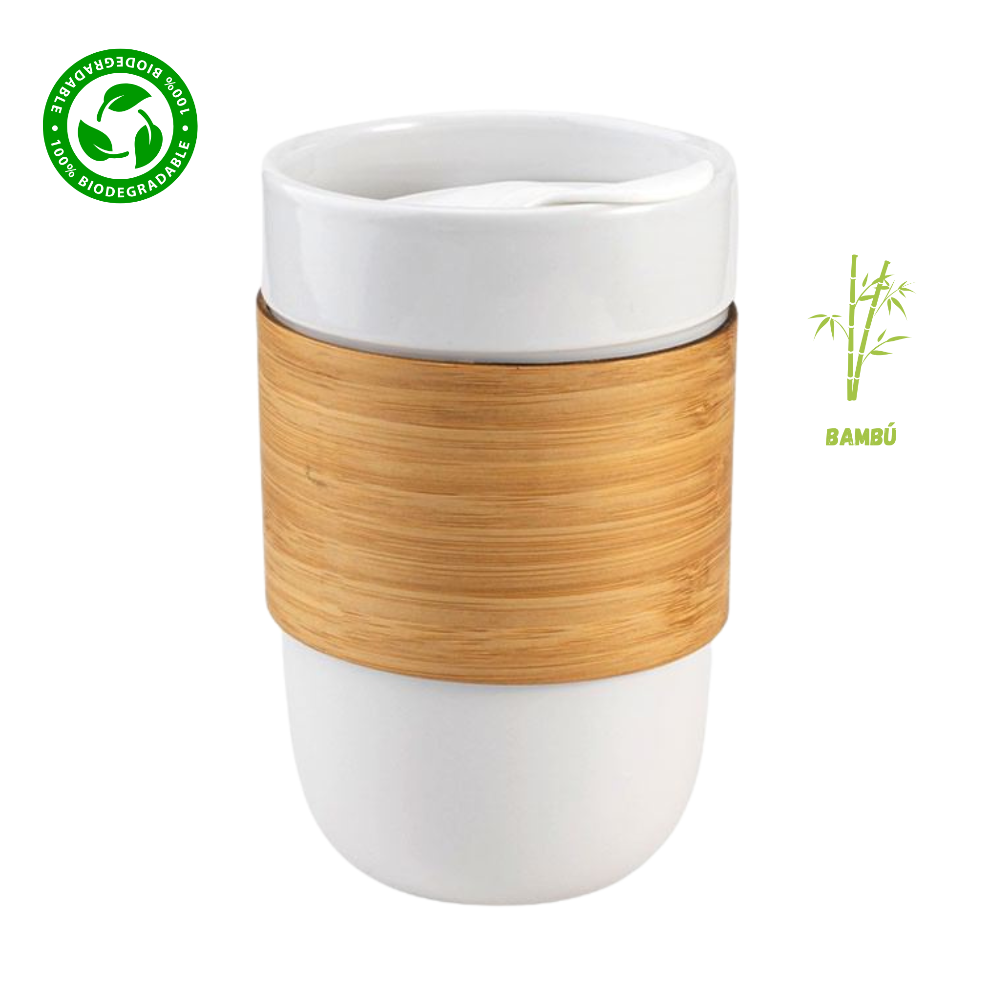 Materiales: Cerámica resistente (cuerpo), Bambú (banda aislante) y Plástico (tapa).