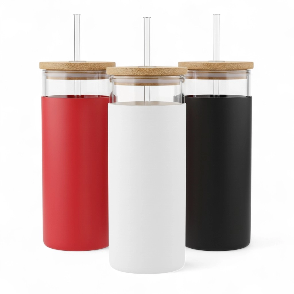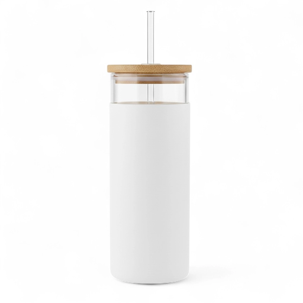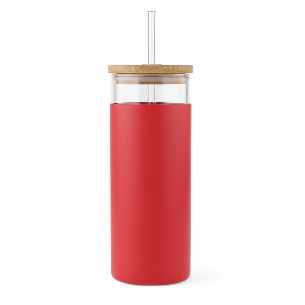 Su diseño moderno incluye una elegante tapa de bambú que se sella a la perfección y un práctico sorbete/popote de vidrio, ambos reutilizables. La manga de silicón de color no solo le da un toque vibrante, sino que también ayuda a mantener la temperatura y ofrece un agarre seguro.
