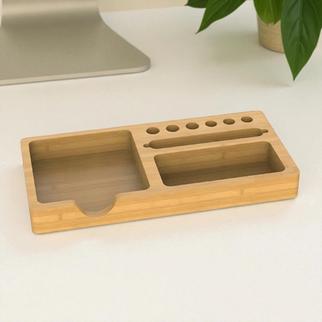 Mantén tu escritorio en orden con este elegante organizador. Fabricado íntegramente en bambú, ofrece una solución natural y eficiente para guardar tus artículos de oficina.