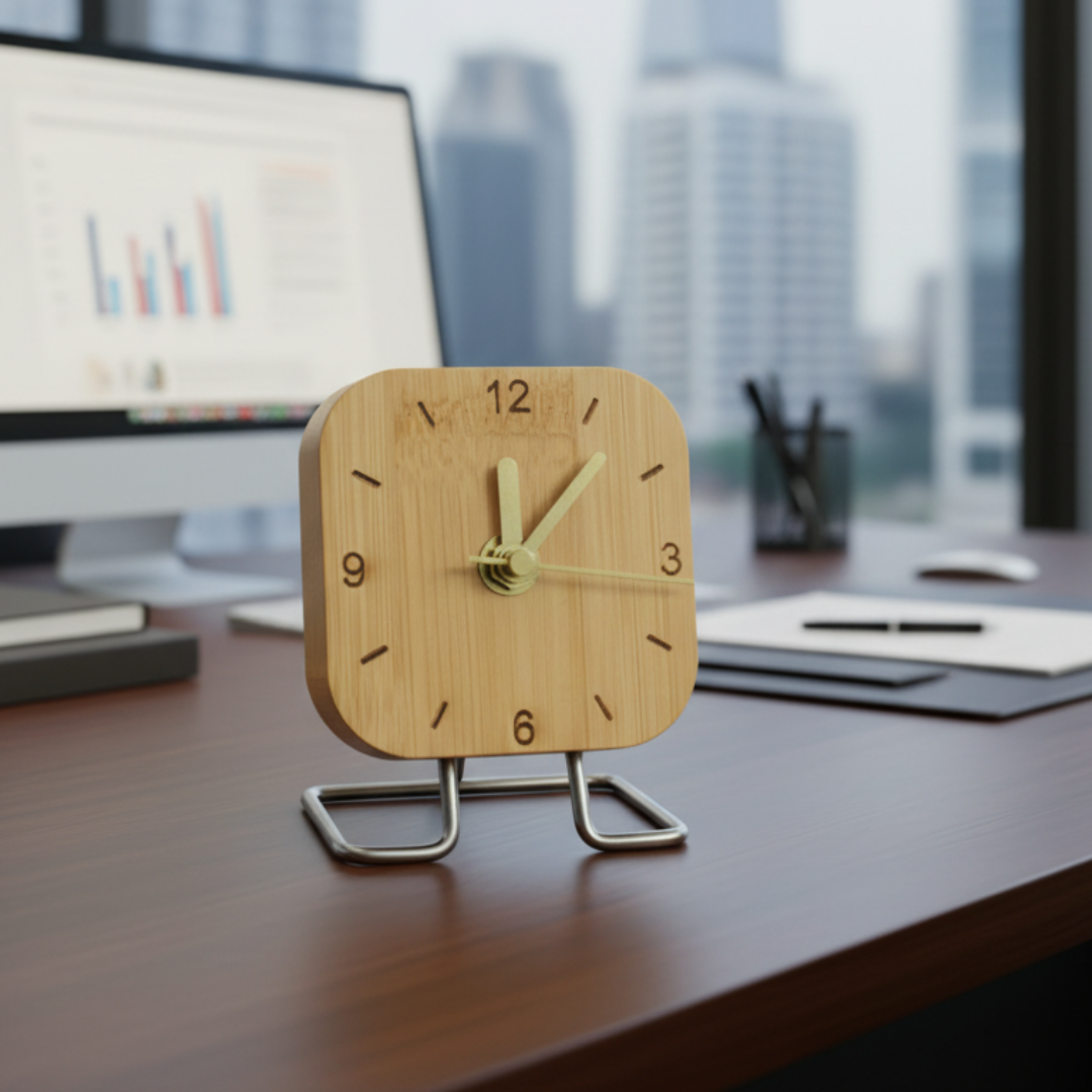 Este reloj no es solo funcional, sino también un accesorio decorativo ideal para cualquier escritorio. Es un excelente regalo corporativo para destacar la elegancia y el compromiso sostenible de tu marca.