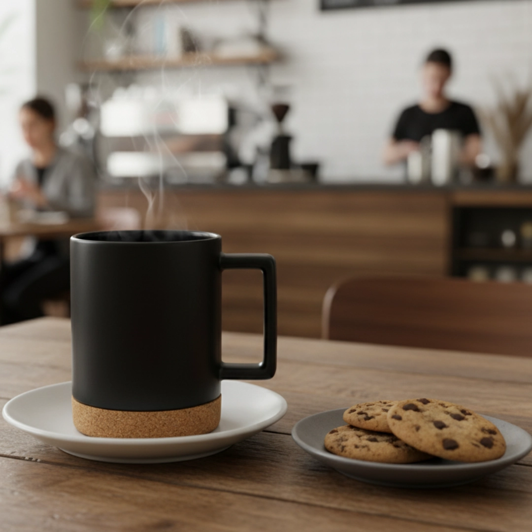 Taza de Cerámica con Base de Corcho y Tapa Plástica.