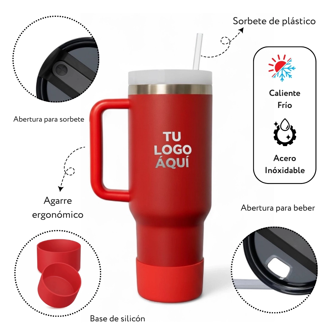 Cuenta con tecnología de doble pared y tapa sellada al vacío para asegurar un aislamiento térmico superior. Su diseño robusto en negro mate incluye una cómoda asa de silicón para un agarre seguro y viene con popote/sorbete
